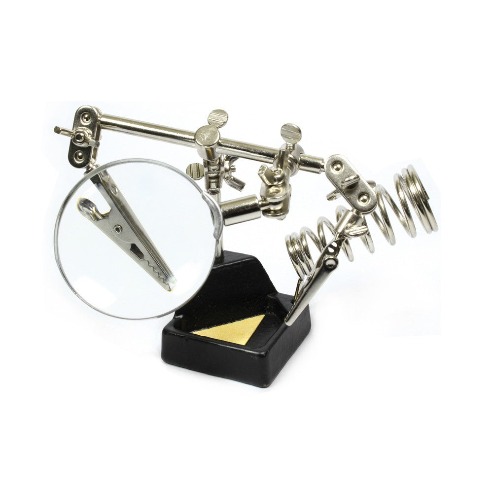 Soporte metálico con pinza y lupa, también conocido como tercera mano gracias a que facilita el trabajo del usuario para la manipulación y sujeción de dispositivos u objetos pequeños y delicados. Principalmente utilizado en el rubro de la electrónica, así como también en la joyería y bisutería.